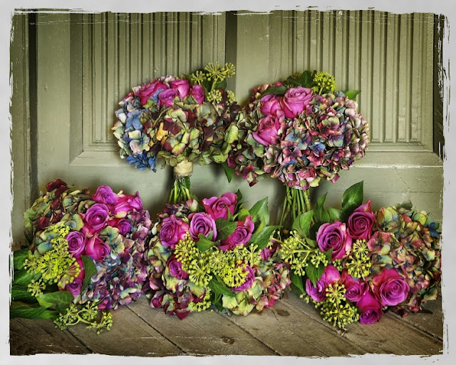 Como la capilla de San Bartolomé está bastante recargada, Delia, la novia, prefirió una decoración minimalista con esferas de Boj de distintos tamaños en cestos de mimbre y Hortensias de color fucsia. El ramo de novia era otoñal, en tonos malvas y verdes, con Hortensias y Rosas…